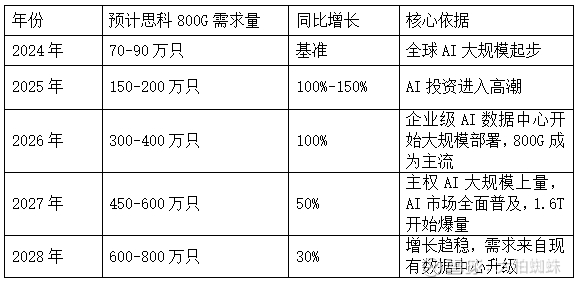 1、2024年,全球800G交换机出货15-20万台,思科份额25%,即出货3.75 - 5万台,乘以20,得到75-100万只光模块的需求,折中保守取值70-90万。