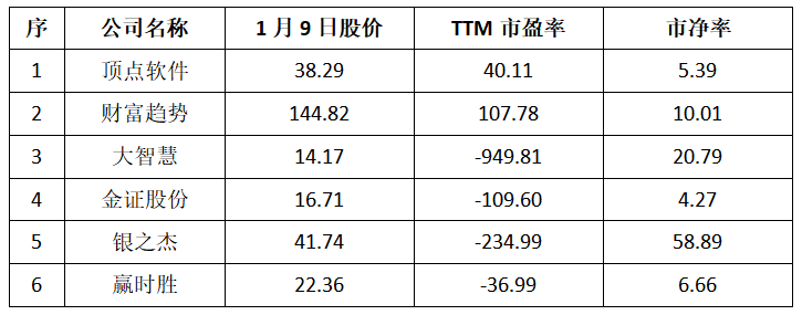 从比较中可以看出,1月9日,顶点软件的总市值78.64亿最小,约为倒数2、3名的一半,约为最高市值财富趋势的1/5。简单统计的实际流通市值,顶点软件37.53亿,约为倒数2、3的40%,约为最高银之杰的1/5。