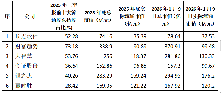 这里统计了前十大股东持股占比,最后的实际流通市值,按照总市值X(1-前十大股东占比)来简单比较。实际上前十大股东持股基本稳定(赢时胜除外,大股东在减持,股价2025表现最差),而除前十大股东外,还有一部分基金持股相对稳定。基金持股一般有不能亏损的要求,而顶点软件历年来一直盈利,符合大多数基金的持股要求,实际流通盘最小。