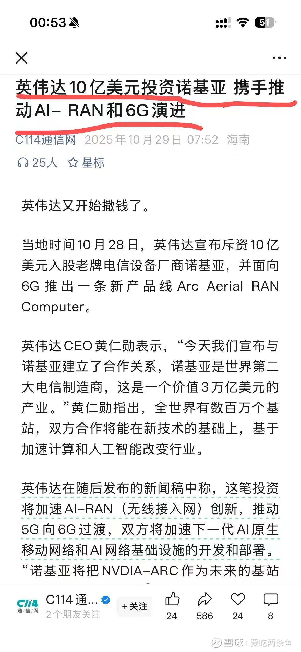 $剑桥科技(SH603083)$$英伟达(NVDA)$ $诺基亚(NOK)$ 昨天黄仁勋GTC大会上说英伟达10亿美元投资诺基亚一起联合推出AI-RAN,而这个市场在2030年可能达到2000亿美元。AI进军通信行业。