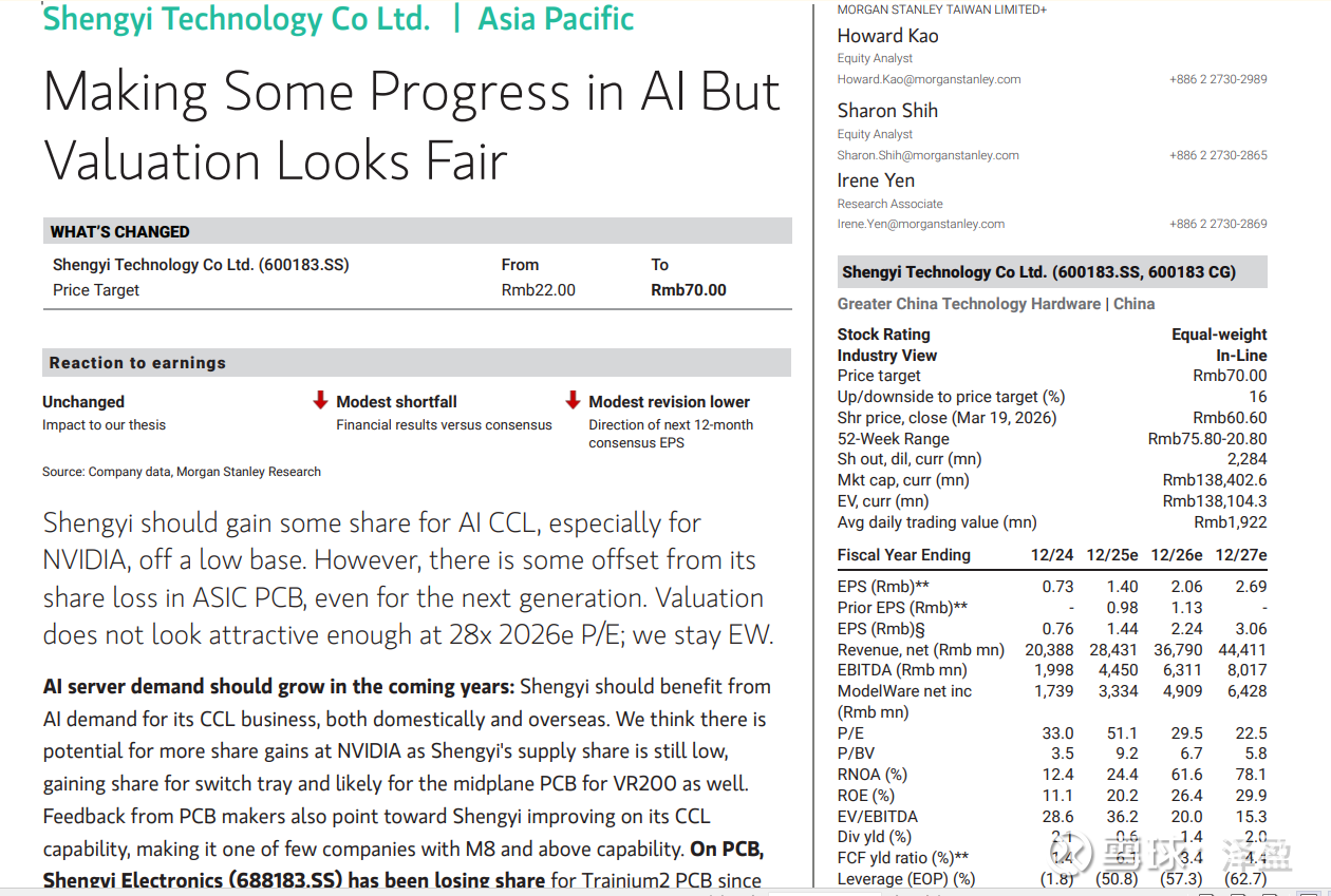 维持对正泰电器(Chint)的同等权重评级 :其对电网客户的业务敞口较少。在我们将目标价上调34%(意味着2026年预期市盈率16.6倍, 高于2013年以来平均15.2倍)后, 我们认为估值吸引力不足.
