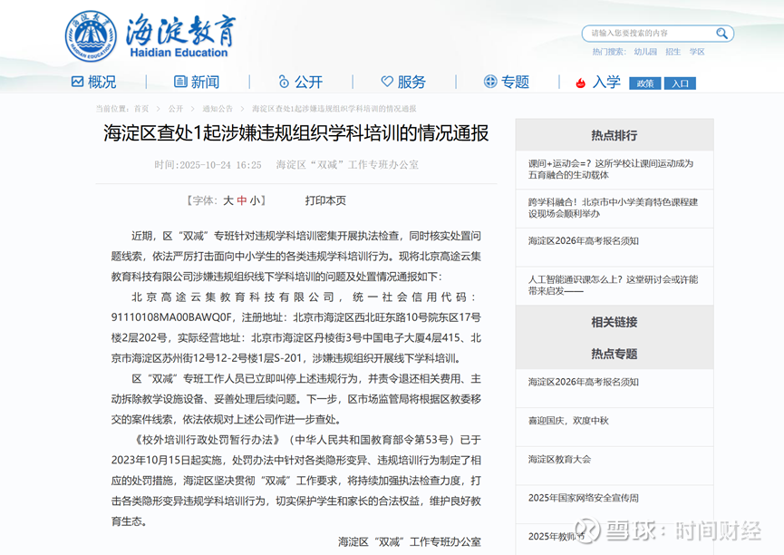 近日,北京市海淀区“双减”工作专班办公室发布通报称,高途集团旗下全资子公司北京高途云集教育科技有限公司(下称“北京高途云集公司”)因涉嫌违规组织开展线下学科培训,已被相关部门查处。