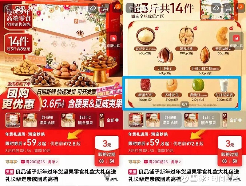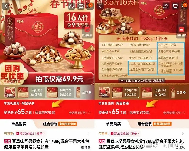 百草味官方旗舰店款标重1788克的坚果零食礼盒,其商品首页展示图片上均为坚果,但该礼盒实则有1248克、近70%的重量来自坚果植物蛋白饮料、果冻爽和灰枣等非坚果产品。图片来源:百草味官方旗舰店