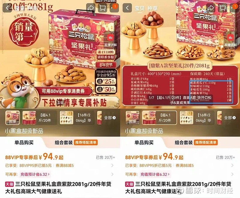 三只松鼠官方旗舰店中的一款重2081克的坚果礼盒,含2罐300ml的坚果乳和其他非坚果零食,坚果类食品总重仅有756克,约占礼盒总重量的36%。图片来源:三只松鼠