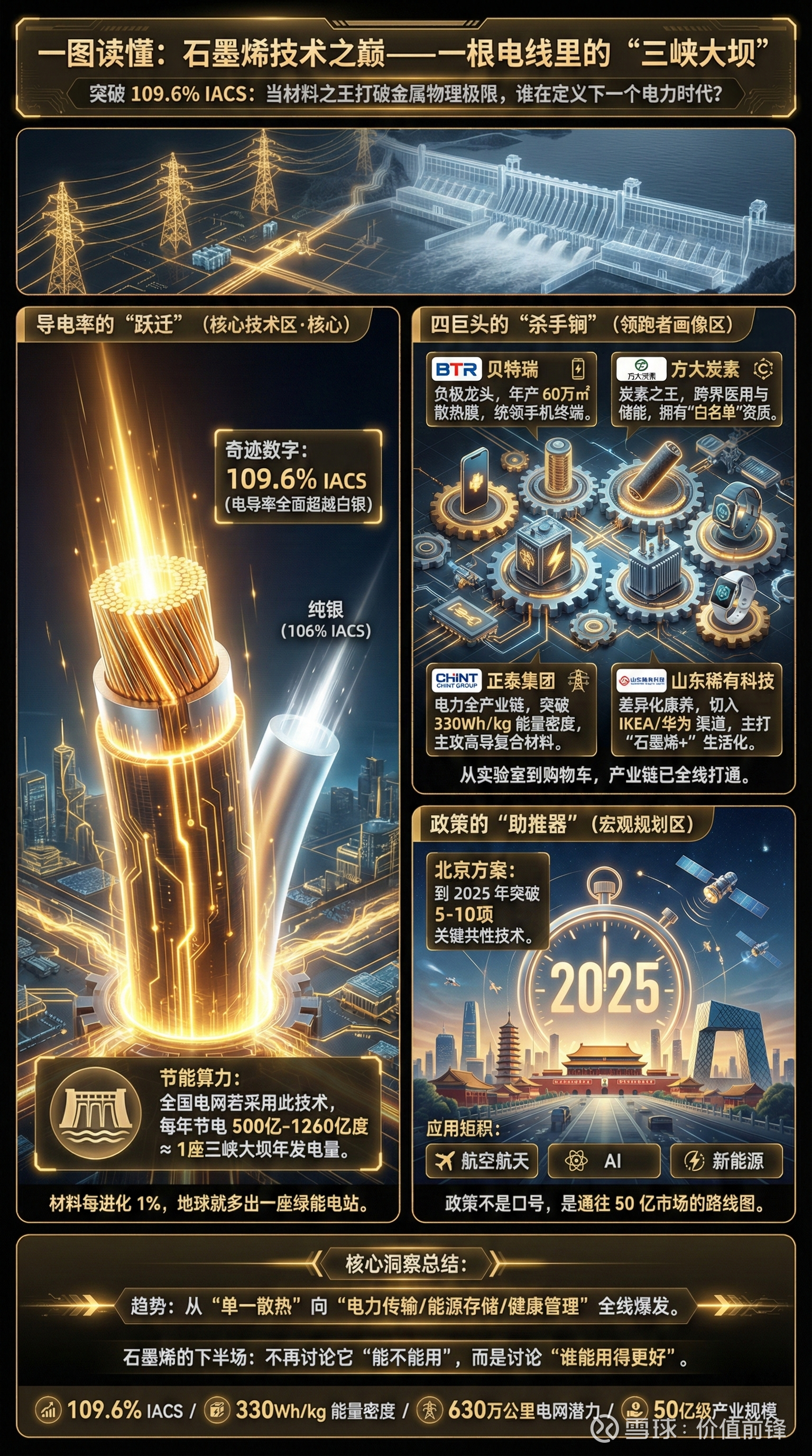 如果全国10千伏、220千伏及以上线路(总长约630万公里)都采用108%IACS的高导电石墨烯铜材料,每年可节约500亿到1260亿度电——这相当于一座三峡大坝的年发电量。
