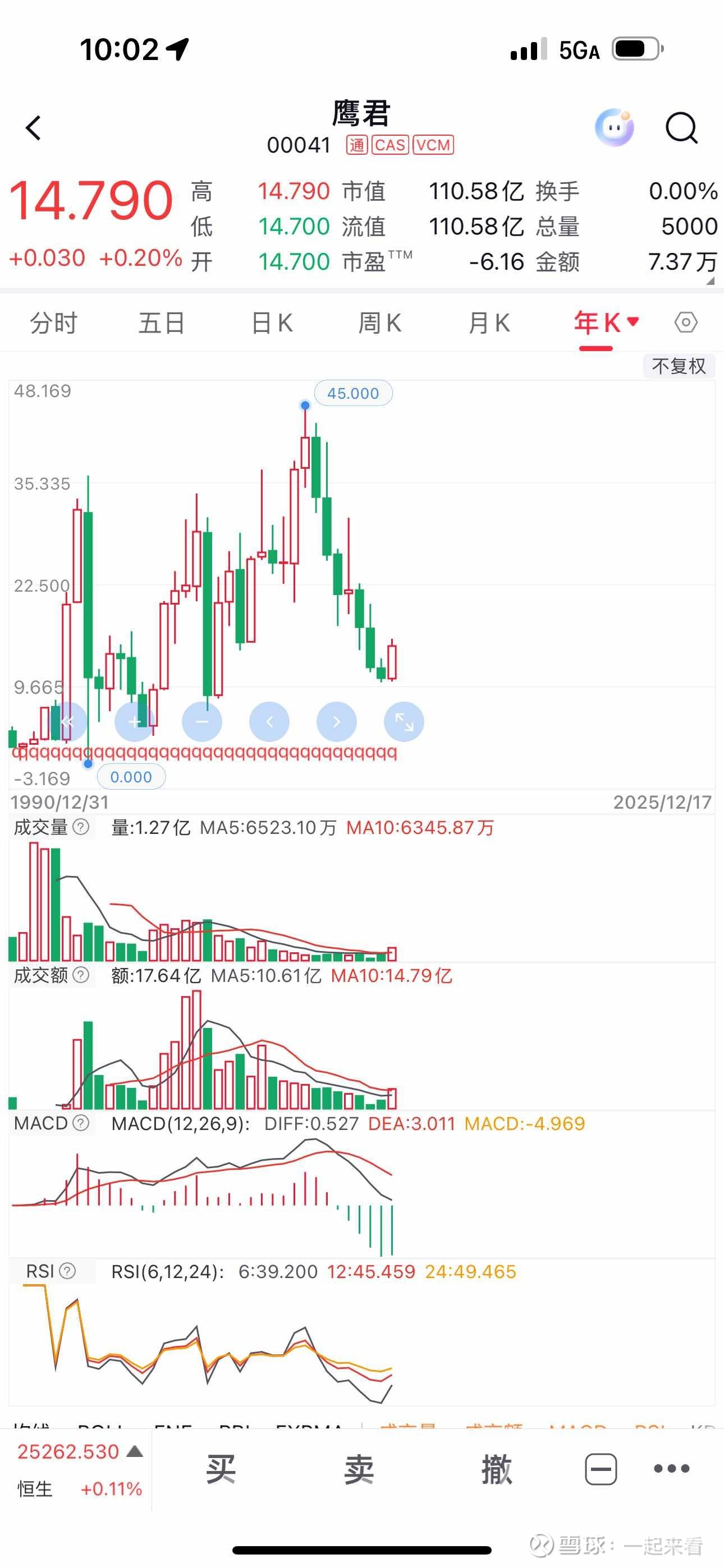 $鹰君(00041)$ 从技术上和基本面来看,15元左右是未来10年-20年的底部,顺便提一下,鹰君10年的股息绝对会让你的持仓成本变成零,到那时回头看看,现在买入的票等于都是白送给你的,买多少送多少…….