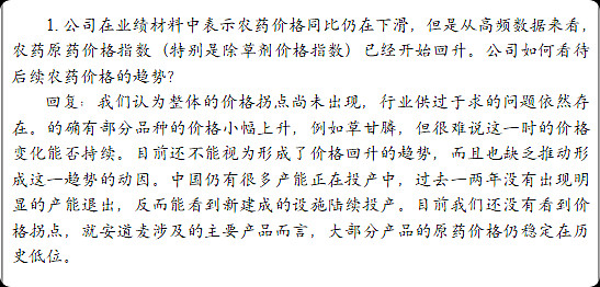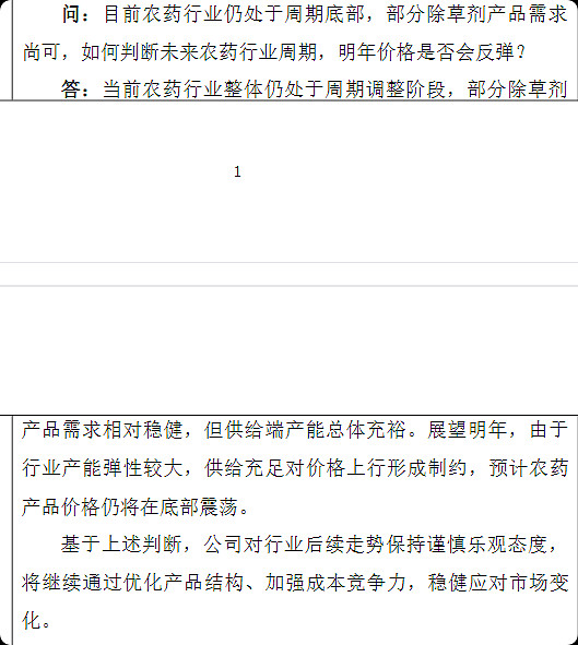 $广信股份(SH603599)$ 这家企业在周期低谷的时候,还能保持30%左右的毛利率,扣非净利率也在10%以上。2025年前三季度的营收只有2022年前三季度一半不到了,而依然保持了一定的盈利能力,证明其竞争力是够强的。资产负债率又低,无偿债压力,只需要等周期到来。但如何判断呢?这家公司公告信息又少,机构调研也没有,投资者问答也没有几个问到点上。那既然都是农药行业,同行业的周期应该相通的。于是就去找$扬农化工(SH600486)$ 和$安道麦A(SZ000553)$ 的相关信息,恰好有机构调研问了这个问题。于是基本上可以得到结论了,行业在2026年可能还是筑底。