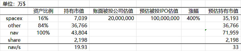 查了下dxyz的官网,披露25年底spacex占其总投资的16%,dxyz25年底nav20/股的话,总nav4.4亿,估算其账面对spacex的估值按约2000亿,如果spacex上市按1万亿算,dxyz其他持仓不变,dxyz的nav=20*(1+400%*16%)=32~33
