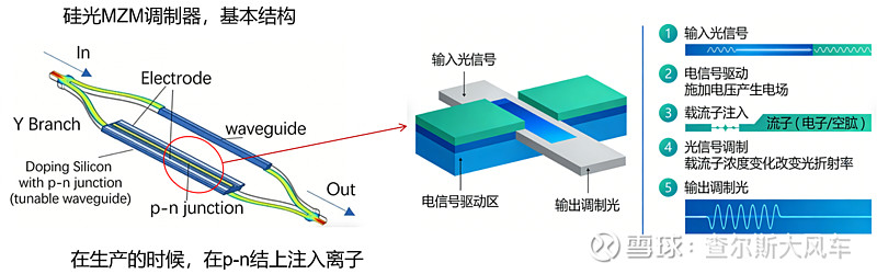 硅光方案的核心是MZM调制器,MZM调制器由上下两个臂的波导型P-N结组成,基本过程是: