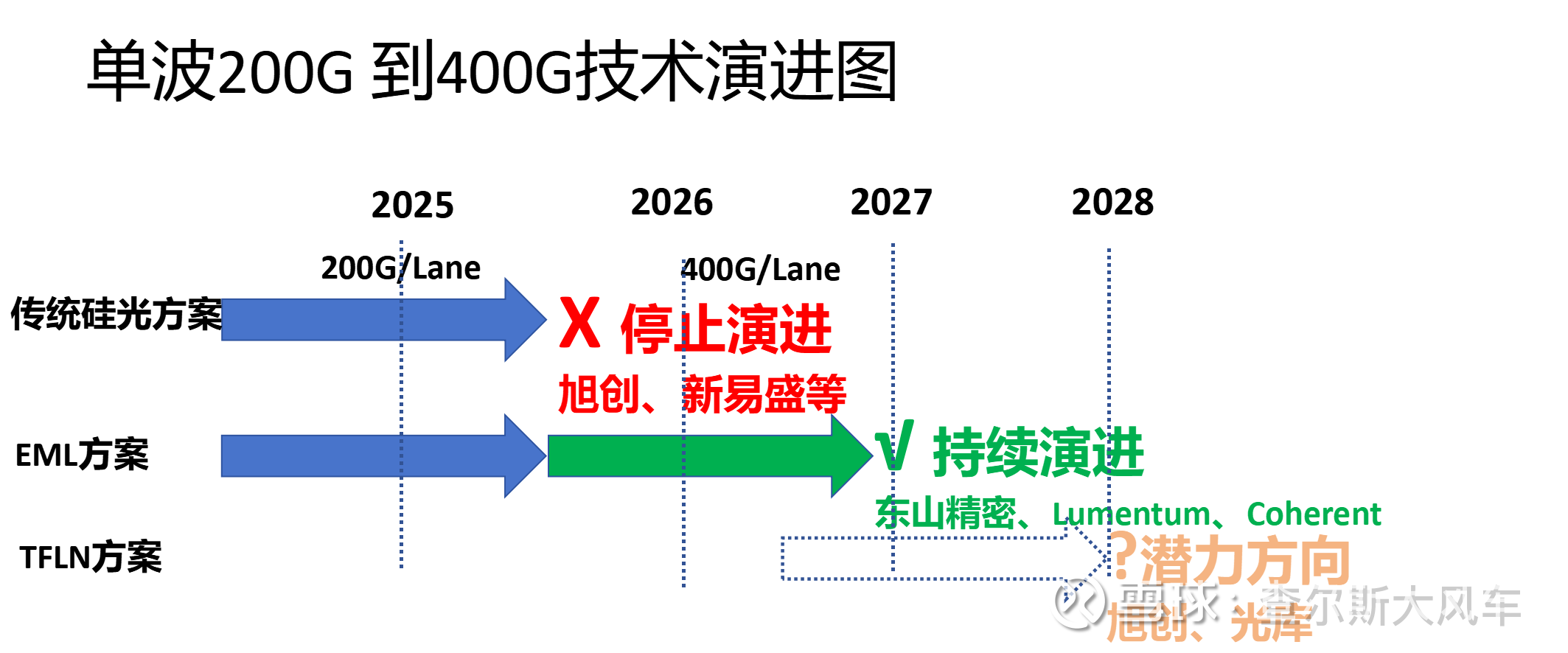 真3.2T =8x400G 方案,目前仅有EML 方案,TFLN方案的潜力很大;传统硅光没有没有方案;