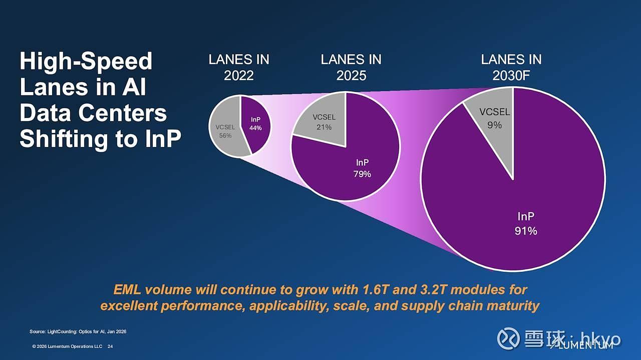 前几天OFC 会议室上Lumentum 关于400G/Lane 技术做了一个判断@hkyo ,我这边做一个解读, Lumentum 一下要新建3个InP工厂 2028年才投产,东山精密的计划是不是保守了?