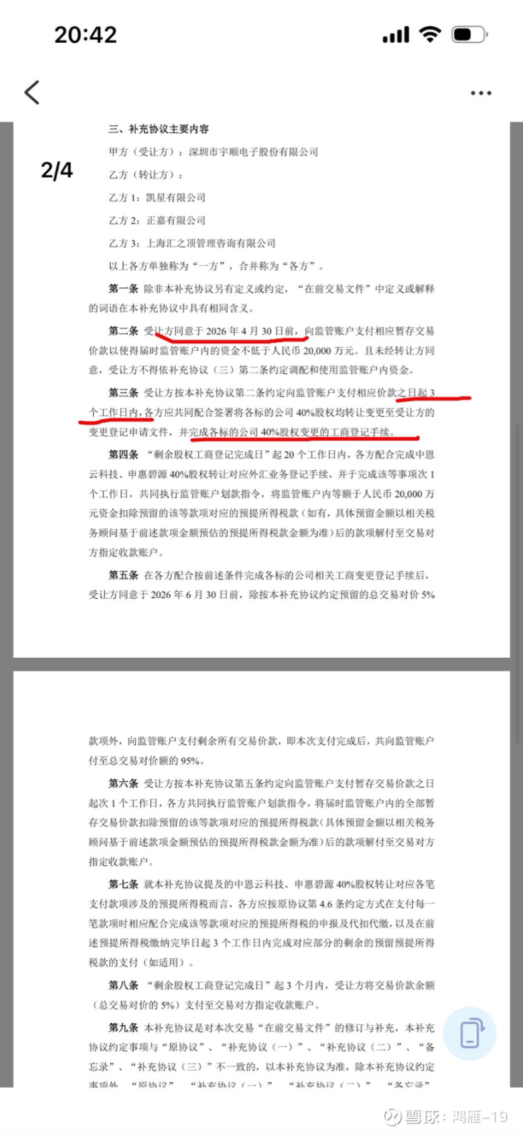 $*ST宇顺(SZ002289)$ 036号公告宣布这个月底前完成重组没有悬念了!4月30日前中恩云剩余40%股权交割款打到监管账户3天内就要完成股权转让登记手续,上次60%交割提前了接近2周,这次40%直接提前了2个月!大股东实力雄厚加上管理层高效运作,赶在年报前完成股权全部变更登记手续可以预期,是否可以申请摘帽的同时再顺便改个NB的名字,复制一下去年大牛股的新征程,各位股东有没有心水的名字啊,宇顺云?