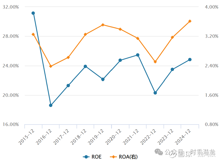 由于其商业模式简单,资产负债表、现金流量表、利润表也比较简单,资产主要是现金、各类财务资产,负债以各类交易保证金为主。依赖于其交易所和结算公司,营收和利润主要靠股票现货和期货交易为代表的交易活动,以及附属于其上的数据服务、投资收益等,在项目上主要是交易、结算、投资3大板块。由于其巨额的保证金,投资收益(底层资产主要是现金、存款、债券)占EBITDA比例达到30%。息税折旧摊销前收益(EBITDA)利润率达到74%,ROE20%以上(roe图表来源于公众号“时乘潜龙”)。