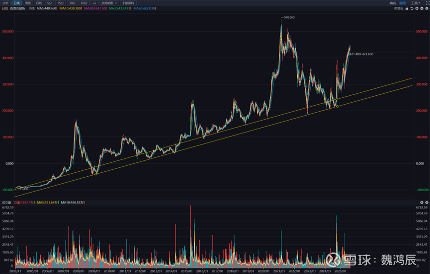 价格变化跟着资本市场的牛熊周期变动,跟买了个大盘指数差不多。但每轮熊市下跌的低点都是逐步在抬升的。这是典型的永续型股票的特征,直接划线买就行。