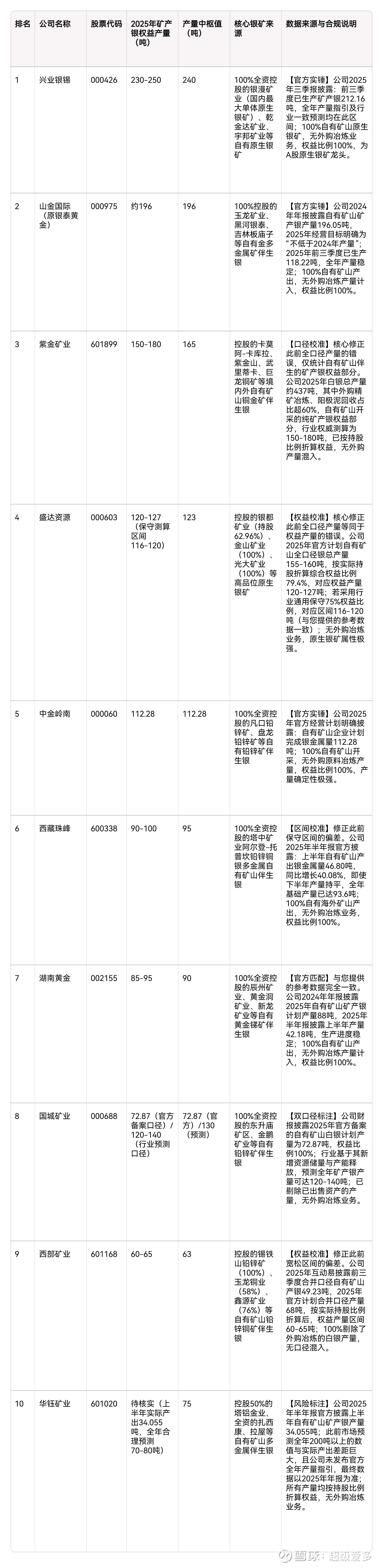 3. 所有上榜公司均已100%剔除了外购原料冶炼、回收的白银产量,完全符合“自有矿山开采、权益口径”的核心筛选要求。