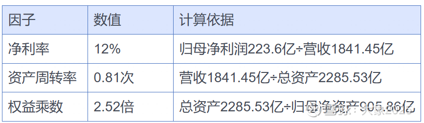 ROE 24% ≈ 净利率12% × 资产周转率0.81 × 权益乘数2.52