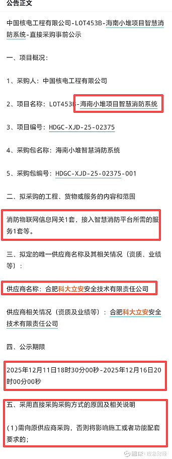 海南小堆智慧消防系统直接采购事前公示于2025年12月11日发布,