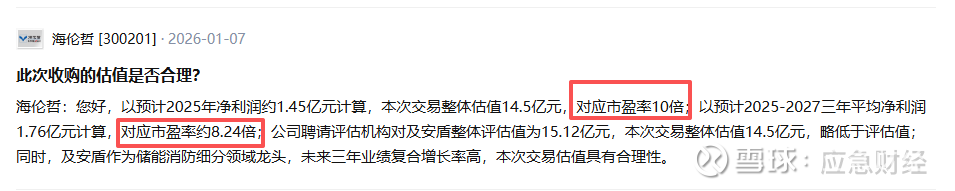 以预计2025年净利润约1.45亿元计算,本次交易整体估值14.5亿元,对应市盈率10倍;以预计2025-2027三年平均净利润1.76亿元计算,对应市盈率约8.24倍;公司聘请评估机构对及安盾整体评估值为15.12亿元,本次交易整体估值14.5亿元,略低于评估值;同时,及安盾作为储能消防细分领域龙头,未来三年业绩复合增长率高,本次交易估值具有合理性。