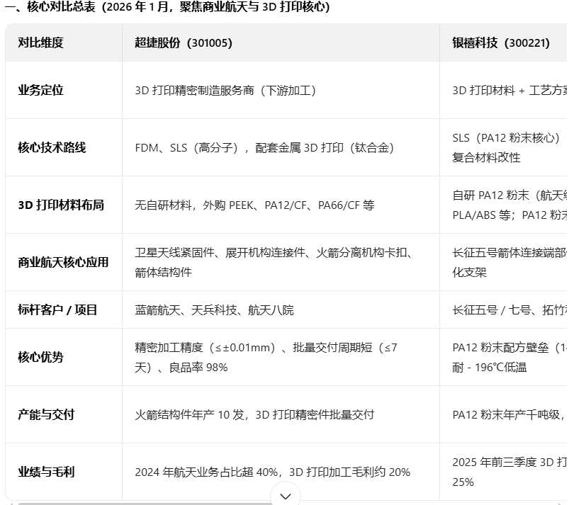 超捷股份与银禧科技在 3D 打印领域的定位差异显著:银禧科技是上游材料 + 工艺方案商,以自研 PA12 粉末 / SLS 工艺切入航天级高分子材料,同时覆盖消费级耗材;超捷股份是下游精密制造服务商,以 FDM/SLS 加工为主,聚焦航天精密结构件,不做 3D 打印材料自研,二者形成商业航天 3D 打印产业链的上下游互补关系。以下从核心维度展开对比,突出各自技术路线、材料布局、应用场景与商业价值的差异: