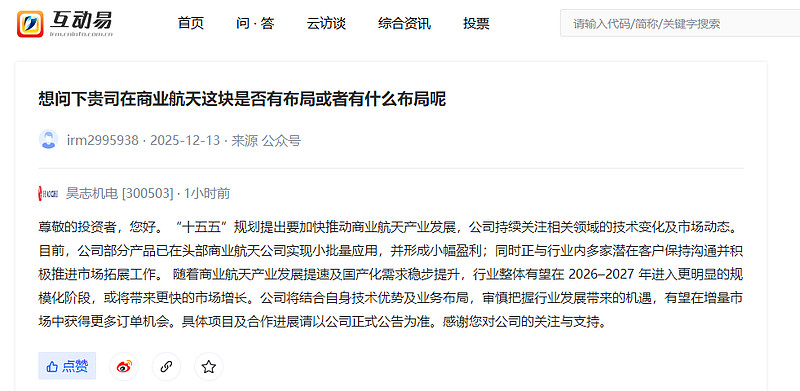 《昊志机电在商业航天领域的核心计划是成为天鹊B系列火箭发动机电机的独家供应商》《蓝箭航天选择昊志机电作为供应商,核心原因是其产品与技术能精准匹配火箭发动机需