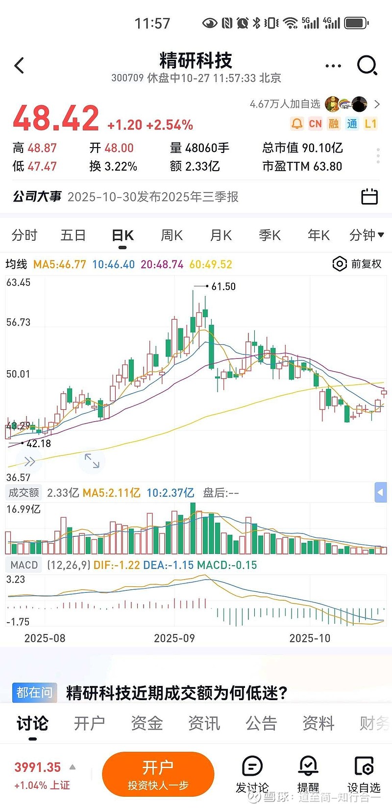 调整结束,前两天46-47极致缩量,MACD即将金叉,随时开启新一轮大涨行情,61.5真不是今年高点