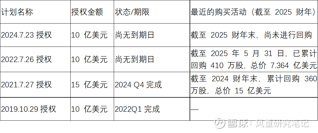 公司秉持了持续回报股东的优秀传统。分红方面,公司自 1983 年上市以来,已连续 38 年增加年度股息(截至 2021 财年)。回购方面,宣布了多项回购计划,目前尚有10亿美元额度。