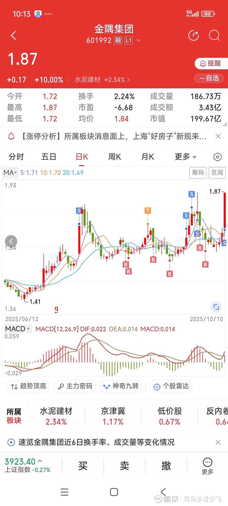 买入在无人问津时,人人都觉得这个行业前途无望了,我也是不知多久这个行业能缓回来或者大概多久会上涨,但是我知道这时的股价通常不高了甚至有点低,至少不会贵到让你站在高高的山岗!至于它什么时候时候涨,那我不知道,一般大概是大部分人都没耐心,悲观失望,然后就忽然间启动了!今日卖出部分金隅股份,明天涨还是不涨我不知道,但是有部分股票到站了,就该下了!
