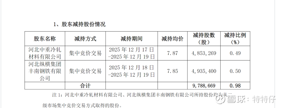 河北中重和河北纵横两个股东(同一时控人河北新华联合冶金控股集团有限公司)在2025年12月中旬,以约7.85元的价格合计减持占总股本0.98%的股份,需要注意的是,截至26年1月16日金固股份11.57元,卖在阶段最低点,少赚47%,世事难料。好在这两家还有5%的股份呢,本次减持后,不再是5%以上股东,未来卖出不需要披露了。