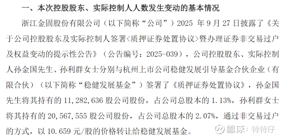 2025年10月10日的公告,这个应该叫“过户式质押”?笔者在网上搜到的都是“杭金投战略入股金固股份”,但其实杭金投3.2%的股份,是这么来的。
