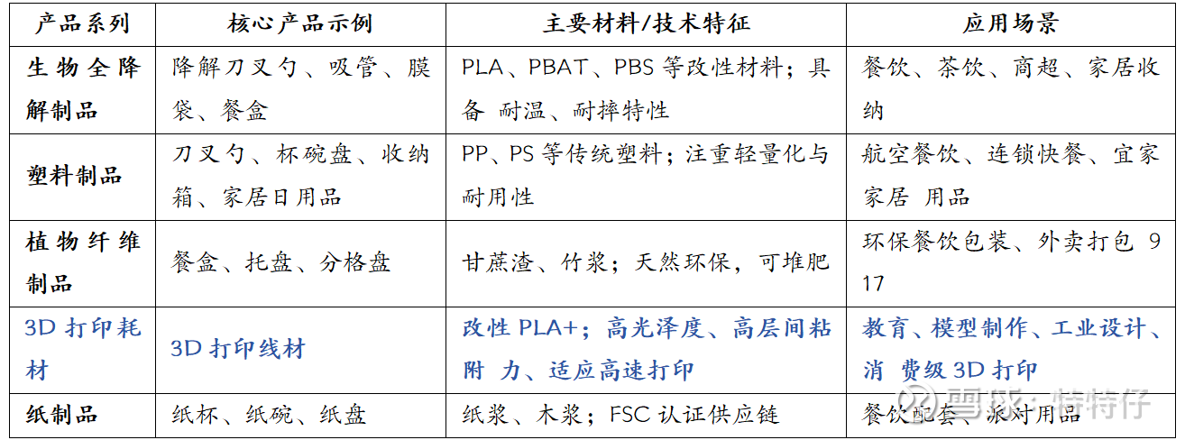 主要产品: 在原有塑料制品基础上,开始推出PLA(聚乳酸)改性材料及PLA餐饮具系列产品。