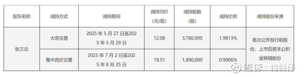 25年8月公告显示张三云在8月完成减持,张三云为公司早期重要股东,25年5月至25年8月合计减持567万股,占公司总股本的3%左右,减持均价为14.56元,减持原因为“自身资金需求”。