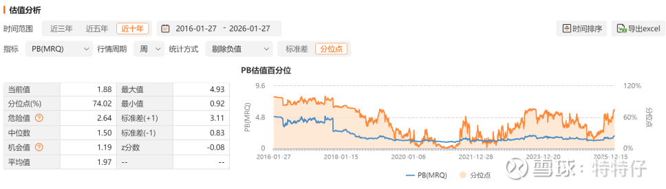 Pb1.88倍处于上市以来74.02%百分位,最低PB0.92倍,最高4.93倍,平均值1.97倍,中位数1.50倍。