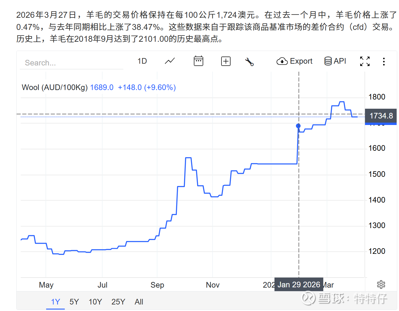 笔者查询了“交易经济学网”:2026年3月27日,羊毛的交易价格保持在每100公斤1,724澳元。在过去一个月中,羊毛价格上涨了0.47%,与去年同期相比上涨了38.47%。这些数据来自于跟踪该商品基准市场的差价合约(cfd)交易。 历史上,羊毛在2018年9月达到了2101.00的历史最高点。