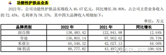 2022 年,华熙生物功能性护肤品收入46.07 亿元,同比增长 38.8%,占当年总营收比例超70%,其中润百颜全年收入约13.85亿元,夸迪全年收入约13.68亿元。