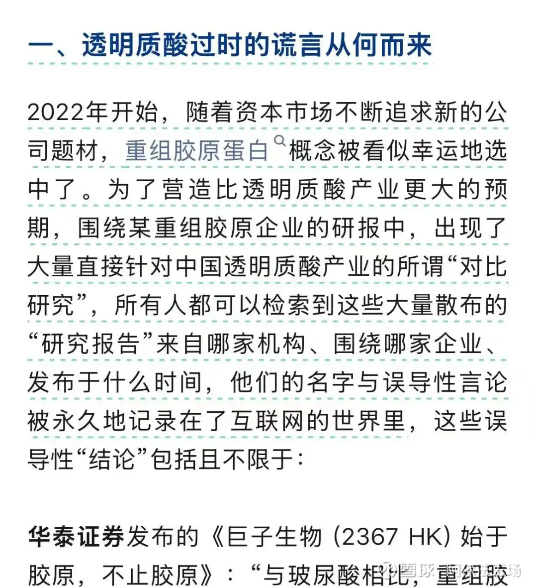 先是今年5月17日,华熙生物官方微信公众号发布题为《概念总在重演,科技永远向前》的文章,直指多家券商为“港股重组胶原蛋白第一股”巨子生物站台。