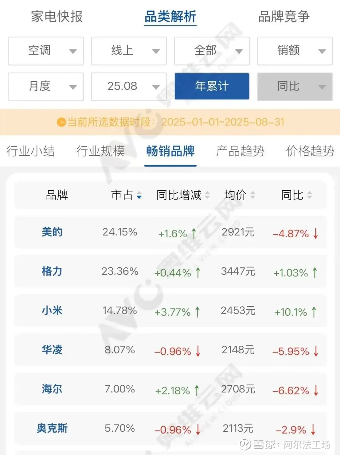 行业龙头如美的、格力引用的都是销售额的口径。比如,格力电器在财报引用奥维云网数据显示,2024 年格力品牌家用空调线上零售额份额为 25.4%,位居行业第一;美的集团也是使用零售额口径,其引用奥维云网数据称,2024年美的集团家用空调的线下市场份额35.9%、线上市场份额33.2%,均列行业第一。