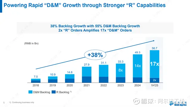 公司财务表现上的一组亮眼数据,正是对此的极佳注脚:2025年上半年,药明康德的持续经营业务在手订单首次突破500亿。自2018年起,药明康德的持续经营业务在手订单的复合增长率达38%,其中D&M端订单增速更是高达55%。与2018年相比,如今药明康德用两倍增长的R端在手订单,带来了17倍增长的D&M端订单。
