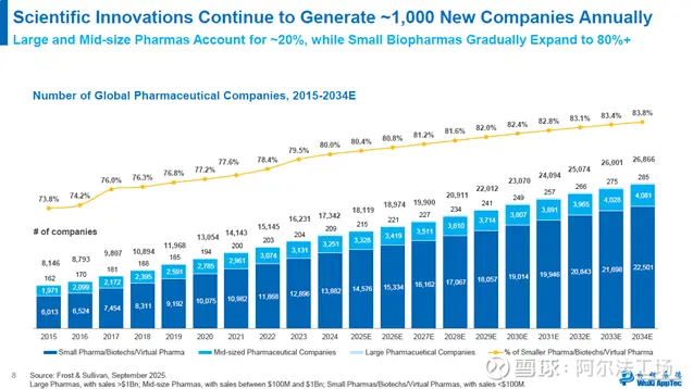 创新源头的多样化也正在加快。每年约有1000家生物科技初创公司成立,在产业前沿探索中扮演着重要角色。中小型公司的研发投入增速高于大型药企,且对外部研发服务的依赖度更高,成为药明康德的重要“长尾客户”。