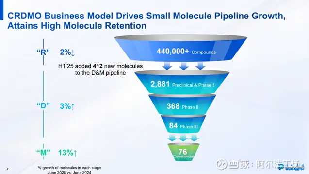 以药明康德极具代表性的小分子管线为例:2024下半年到2025上半年的12个月里,其小分子业务在R端共交付超过44万个化合物;D端(临床前-临床3期)管线中共3333个分子,同比增长3%;M端共76个分子处于商业化生产阶段,同比增长13%。合作规模在临床后期和商业化阶段持续扩大,3期及以上小分子项目数从2022年的107个增加至2025年上半年的160个。