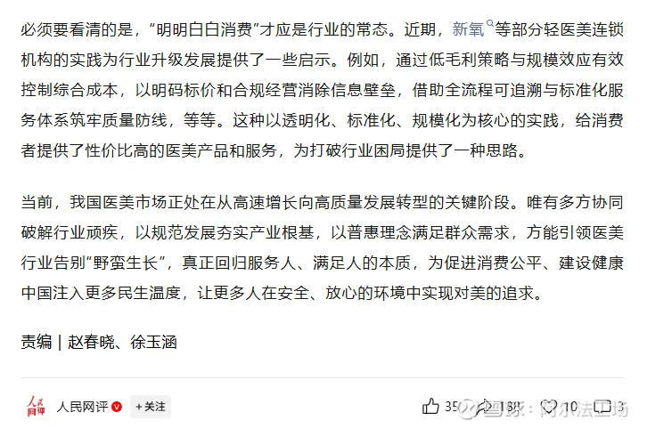 10月11日,人民网《“变美”之路不能成为“踩坑”之旅》一文也提到,新氧等部分轻医美连锁机构,通过低毛利策略与规模效应有效控制综合成本,以明码标价和合规经营消除信息壁垒,借助全流程可追溯与标准化服务体系筑牢质量防线等透明化、标准化、规模化为核心的实践,给消费者提供了性价比高的医美产品和服务,也为打破行业困局提供了一种思路。