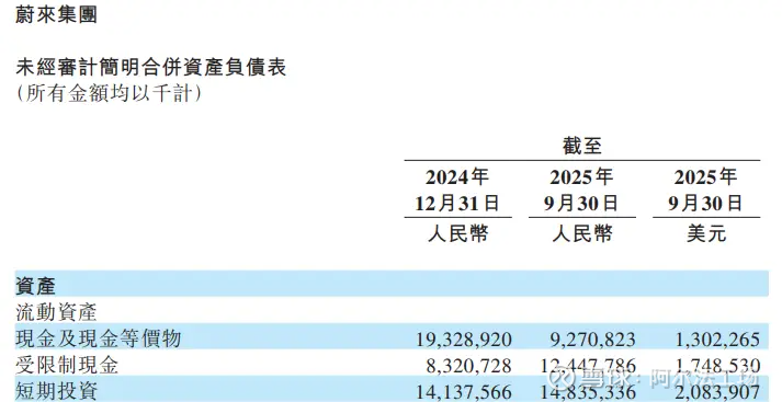 截至2025年三季度末,蔚来现金及现金等价物+受限制现金+短期投资共367亿元,但其中现金及现金等价物只有92.71亿元,较去年底的193.29亿元直接“腰斩”。