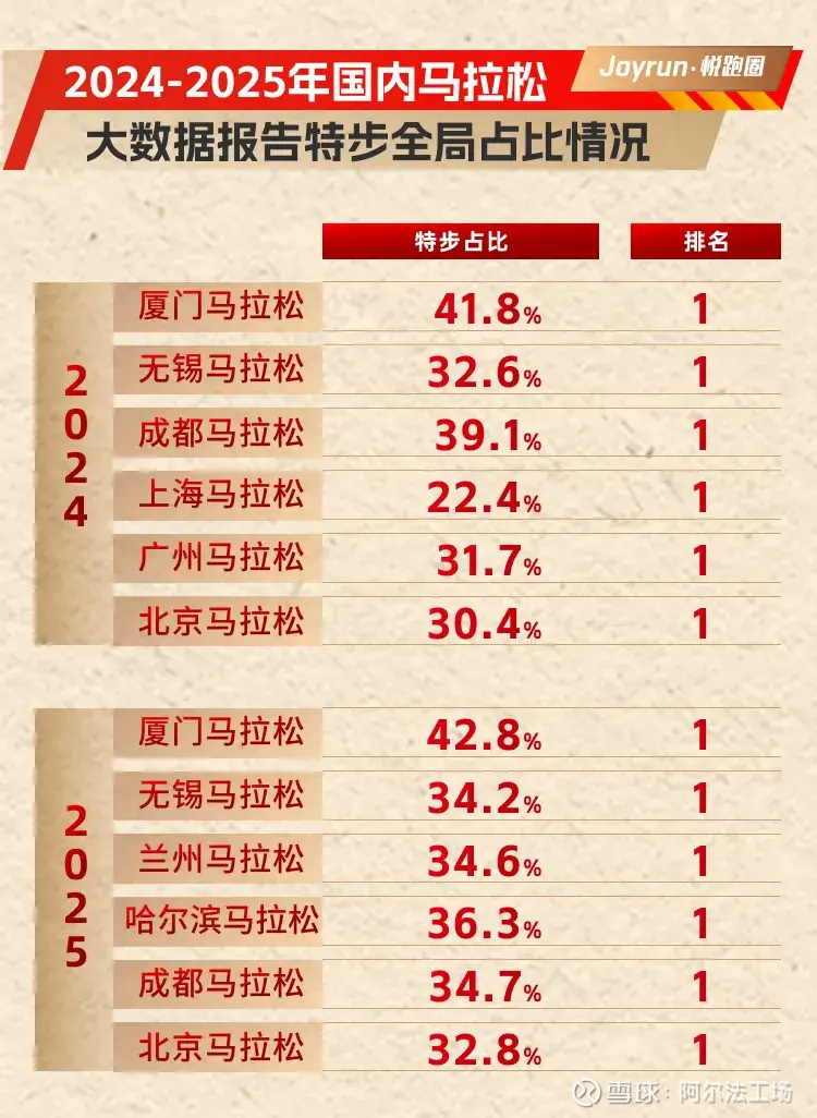 至于面向普通大众与进阶跑者的市场占有率方面,据悦跑圈数据显示,在2025年国内包含厦门、无锡、兰州、哈尔滨、成都、北京、上海、广州在内的多个核心城市的马拉松赛事中,特步跑鞋的全局穿着率毫无悬念地包揽了全部全品牌第一,可以说是没有任何争议的第一品牌。