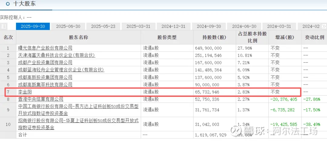 此外,李金阳还曾现身半导体巨头海光信息(688041.SH)的十大股东名单,截至2025年9月30日,其持股海光信息6573万股,占流通股比例2.83%。而截至2026年3月24日收盘,海光信息股价213.27元/股,总市值约4951亿元,李金阳持股比例对应流通市值超140亿元。