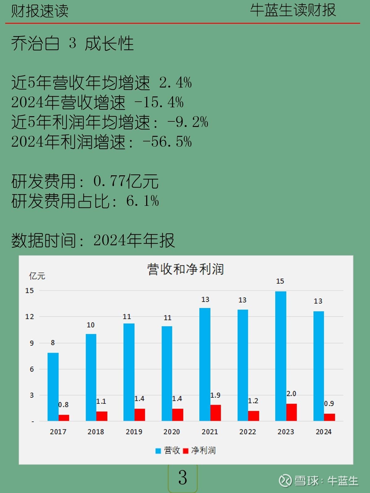 3. 成长性:近5年营收年均增速2.4%,2024年营收增速-15.4%;近5年利润年均增速-9.2%,2024年利润增速-56.5%;研发费用0.77亿元,占比6.1%。