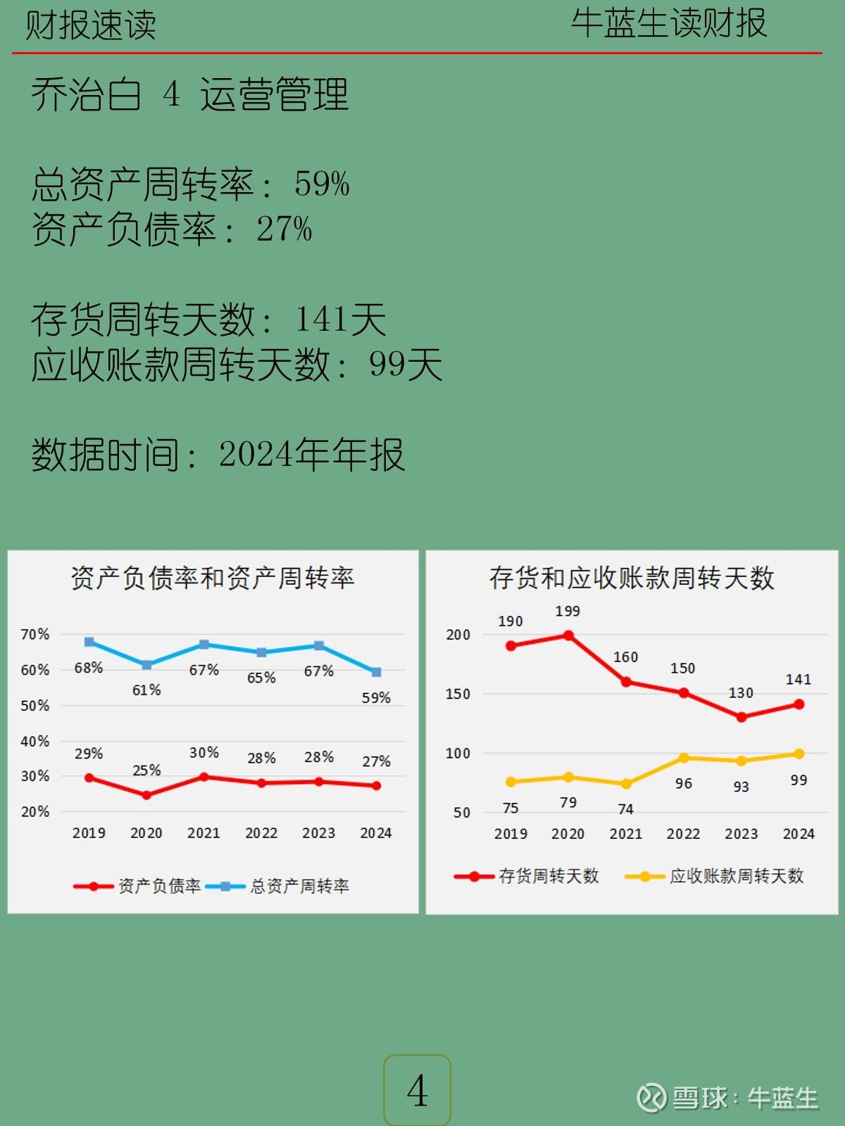 4. 运营管理:总资产周转率59%,资产负债率27%,存货周转天数141天,应收账款周转天数99天。