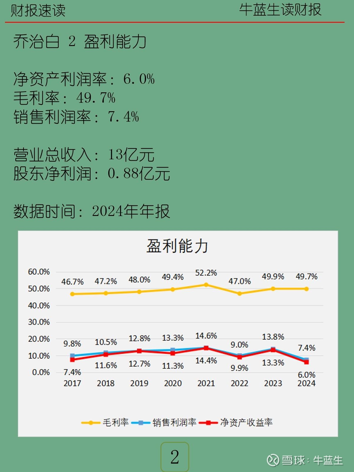 2. 盈利能力:净资产利润率6.0%,毛利率49.7%,销售利润率7.4%,营业总收入13亿元,股东净利润0.88亿元。2025年1季度,公司营收和净利润分别增长10.6%和-31.5%。
