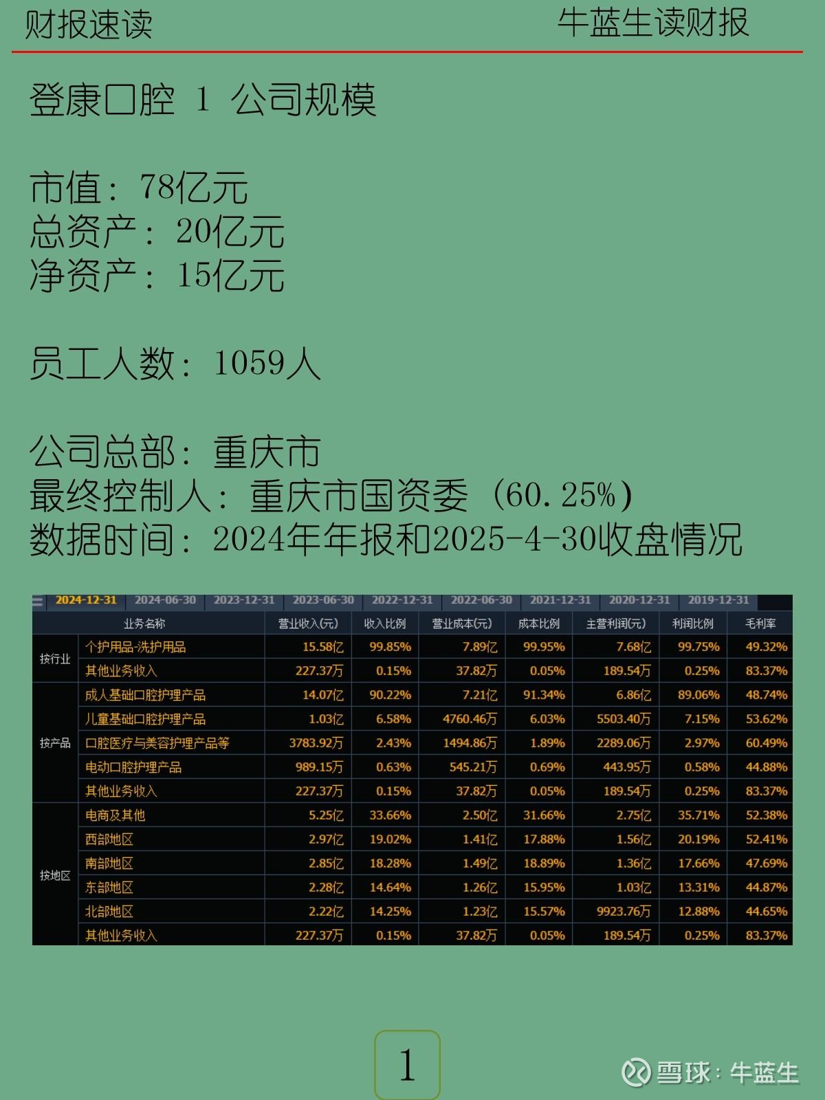 登康口腔(“冷酸灵”母公司)总部重庆,最终控制人为重庆市国资委(持股60.25%),是中国抗敏感牙膏细分龙头,核心品牌“冷酸灵”连续多年市占率第一,产品覆盖成人及儿童牙膏、牙刷、漱口水等,2025年4月末市值78亿元,员工1059人。