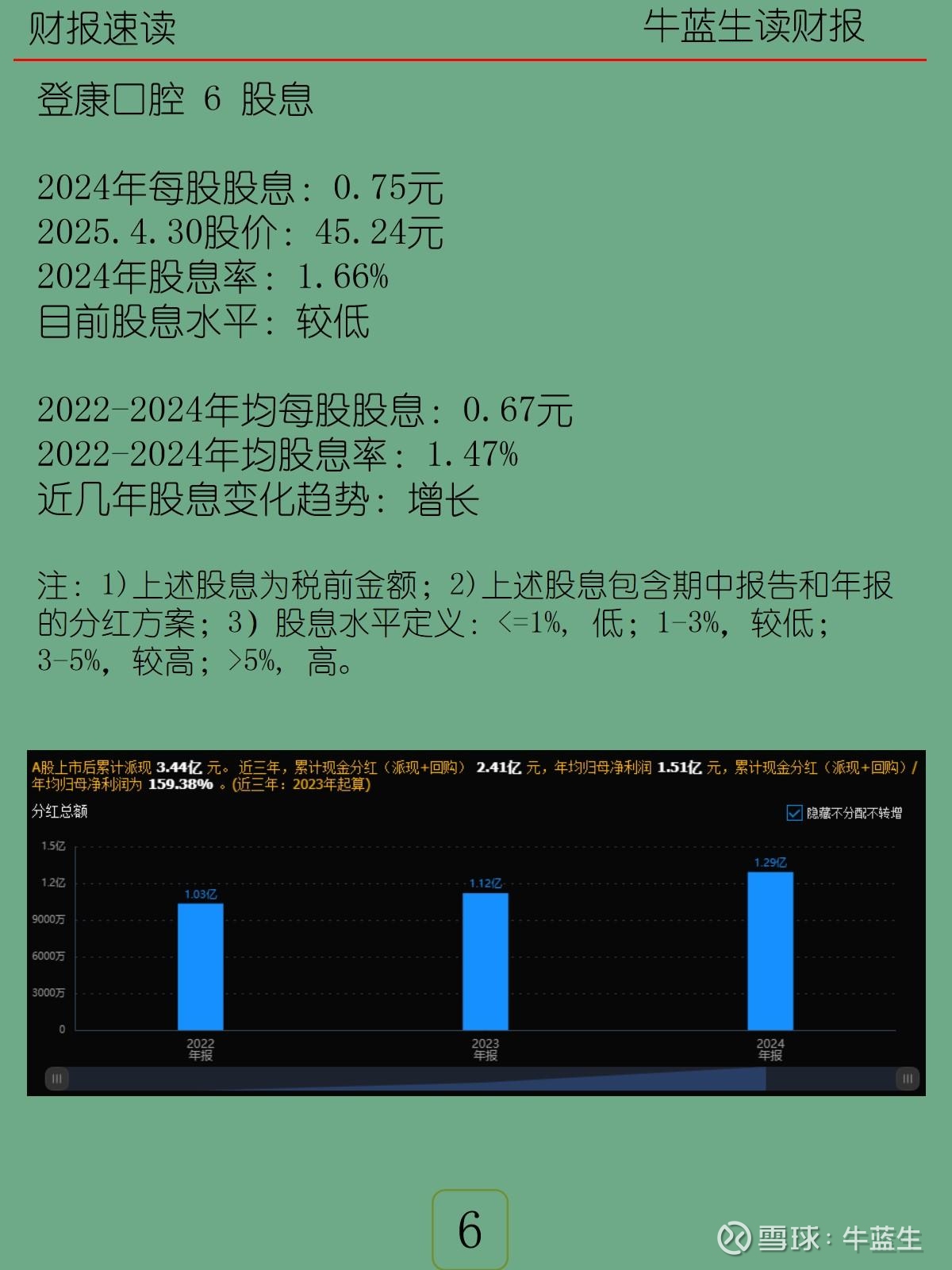 -股息:2024年每股股息0.75元,按2025-04-30股价45.24元计,股息率1.66%,属“较低”水平;近三年平均股息率1.47%,趋势持续增长。