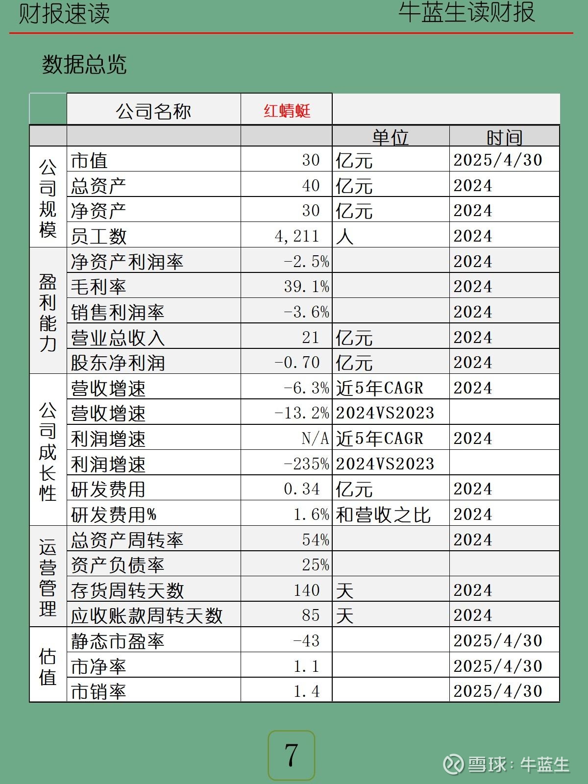 - 成长性:近5年营收CAGR -6.3%;2024年营收-13.2%,净利同比-235%;研发投入0.34亿元,占比1.6%。