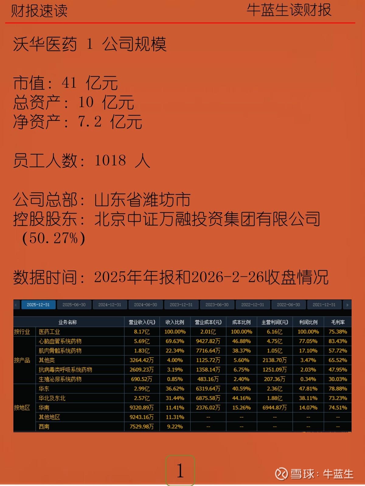 沃华医药(Shandong Wohua Pharmaceutical)总部位于山东省潍坊市,控股股东北京中证万融投资集团有限公司持股50.27%。公司是一家专注于中成药研发、生产和销售的医药企业,主要产品涵盖心脑血病、妇科疾病、骨病等领域。公司拥有多个独家品种和中药保护品种,在心脑血病中成药细分市场具有较强竞争力,是集研发、生产、销售为一体的现代化中药企业。
